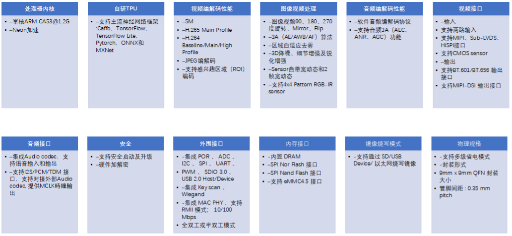The chip also integrates a self-developed TPU that can provide about 0.5TOPS computing power under INT8 computing. The specially designed TPU scheduling engine can effectively provide extremely high bandwidth data flow for the tensor processor core; and provides users with a powerful deep learning model compiler and Linux software SDK development package. Mainstream deep learning frameworks, such as Caffe Pytorch ONNX MXNet and TensorFlow (Lite) framework mainstream networks can be easily transplanted to the platform.