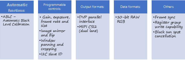 JX-Q03P is a high-performance 3.0MP BSI CMOS image sensor designed and manufactured using SOI's 2.0um pixel technology. The JX-Q03P consists of a 2304x 1296 active pixel sensor (APS) array with on-chip 10-bit ADC, programmable gain control (PGA) and correlated double sampling (CDS) functions to significantly reduce fixed pattern noise (FPN). The sensor also has many standard programmable and automatic features. It supports both industry-standard DVP parallel interface and MIPI CSI2 dual data lane serial interface. External host controllers can access the device through a standard serial interface. The sensor is available as a wafer-level packaged CSP.