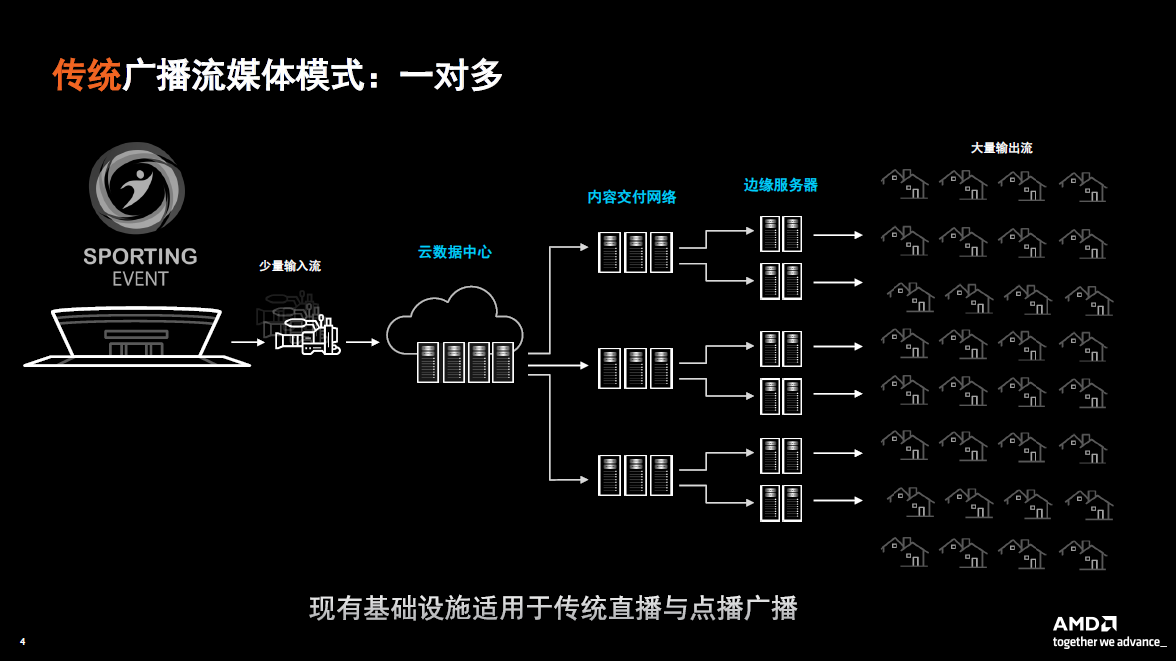 Currently, traditional broadcast streaming is mainly supported by software and CPU. Traditional live broadcast activities mainly adopt a one-to-many model. Since the number of video streams is relatively small and the delay is relatively controllable, more traditional existing network forms can be used to support live broadcast services.