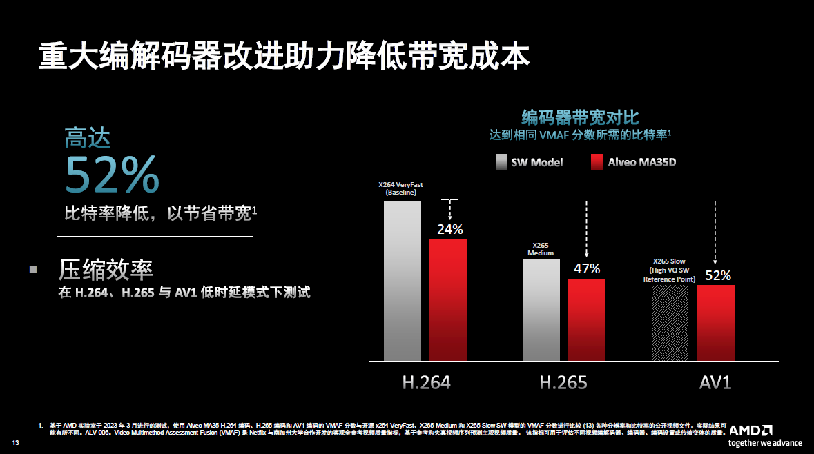 Bandwidth consumption is a very large operating expense for streaming media customers. AMD is also working on improving its codecs. As shown in the histogram in the figure below, the left side is the benchmark. A line lower than this indicates bandwidth savings. Of course, in this process, there is an assumed standard, that is, the quality of the video can reach the usual level. Therefore, through comparison of these references, we can see that the AV1 encoder can achieve the same visual quality, but its bandwidth saving is as high as 52%.