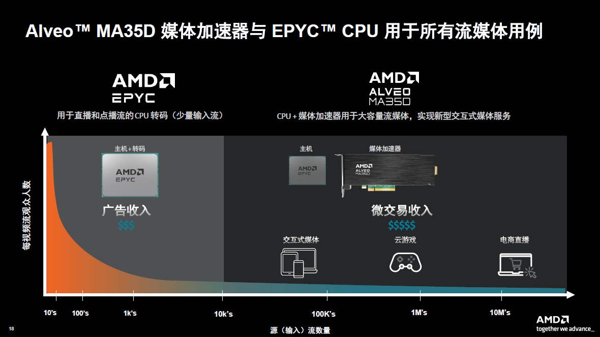 The figure below further explains that EPYC CPU is excellent for a certain type of APP, and Alveo MA35D is very suitable for other types of applications. In general, the software and CPU are suitable for a relatively small number of streaming videos, and the Alveo MA35D is suitable for interactive scenarios with millions of streaming videos.