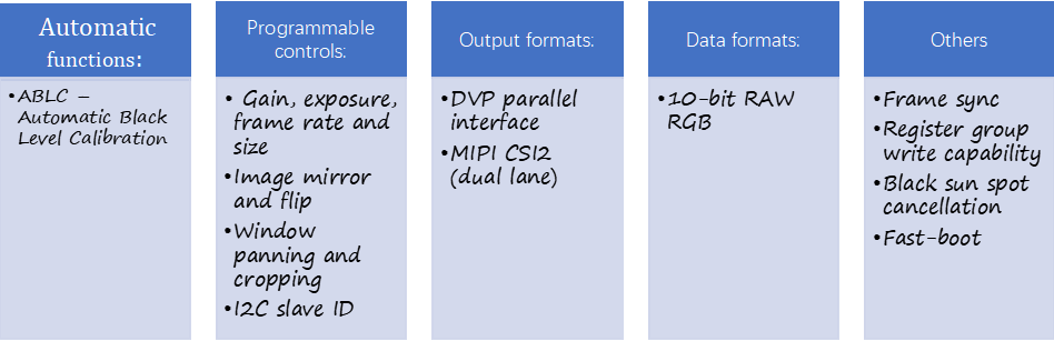 1. Main control cv1821 specifications:.Single-core ARM [email protected]; .Image and video 90, 180, 270 degree rotation, Mirror, Flip; .MiPi interface; .9mm x 9mm QFN package size; .Integrate POR, ADC, I2C, SPI, UART, PWM, SDIO 3.0, USB 2.0 Host/Device; .Built-in DRAM;2.sensor_soi_K302P specifications:.4.1MP CMOS image sensor; .Resolution: 2696*1528; .10-bit RGB Raw Data; .Full: 2688x1520 @60fps .HDR: 2688x1520 @ 30fps .DVP parallel and MIPI CSI2 dual data lane serial interface;